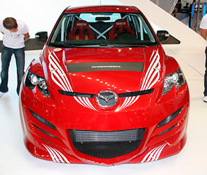 Стоящая рядом с концептом Kazamai ярко-красная Mazda CX-7 в спортивном обвесе, привлекает внимание не меньше чем будущий кроссовер. Это уникальный проект, носящий имя "Русская борзая", создан совместными усилиями компании Mazda и компании Kesselman Motorsport под руководством известного российского автогонщика Олега Кесельмана.