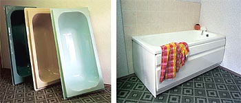 Акриловые вкладыши изготавливают по индивидуальному заказу – любого цвета и даже формы. По желанию можно закрыть «новую акриловую» ванну такими панелями (справа)