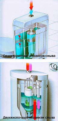 Пятое. Немаловажное значение имеет механизм смыва унитаза, который располагается в бачке. Как правило, львиная доля неприятностей возникает именно из-за него: то вода начинает просачиваться и чаша рыжеет от ржавчины, то вдруг в самый неподходящий момент перестает работать смыв, то наоборот — вода течет потоком, не останавливаясь. Причин неисправностей современных механизмов несколько. Вот самые распространенные. Во-первых, их слабая приспособленность к жесткой воде, где много примесей и взвешенных частиц. Для предотвращения неполадок целесообразно ставить на вводе холодной воды в квартиру фильтры грубой и тонкой очистки. Во-вторых, искривление пластика, составляющего основу конструкции, которое происходит чаще всего при заметном перепаде температуры воды в бачке, а также плохое качество самого пластика. В-третьих, истирание или старение прокладок и других подобных элементов. Один из способов избежать неисправностей сливного бачка — это выбрать модель с простой конструкцией. В последние годы с Запада пришла мода на установку двухскоростных бачков: при нажатии одной кнопки вытекает для смыва 6 или 8 литров воды, при нажатии другой — 2 или 4 литра. Вместе с этим периодически возобновляется кампания по смене российского стандарта бачков на иностранный — бачки меньшего объема. Однако проблема лишнего расхода воды решается (и уже давно) другим, более простым и дешевым путем — установкой механизма, подающего объем воды в зависимости от продолжительности удержания кнопки (рычага) управления смывом. Прежде чем приобретать унитаз со сливным бачком, поинтересуйтесь у практикующего сантехника, какой механизм лучше. Он может рассказать много интересного из того, что обычно не публикуется в печати. К сожалению, до сих пор встречаются модели механизмов и очень известных компаний, которые тем не менее имеют недоработки, не говоря уже о многочисленных подделках. Нередки случаи, когда иностранный санфаянс начиняют неопознанными сливными механизмами.
