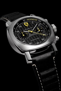 Думаю, не нужно лишний раз напоминать, что карбон пришел в часовое искусство из автомобилестроения. Одним из первых его начали применять при создании формулических болидов легендарная итальянская компания Ferrari. Из прочнейшего и невесомого карбона создаются детали кузова алых «жеребцов» из Маранелло, а также рабочие поверхности тормозных дисков. В этом году Ferrari исполняется 60 лет. В честь юбилея часовая компания Panerai выпустила серию моделей, в которых, конечно же, не могла обойтись без карбона. Из него сделан циферблат и очень похожие на спидометр и тахометр Ferrari счетчики хронографа. Кстати, у этого хронографа, как и у автомобиля Ferrari, - свой оригинальный двигатель - первый автоматический хронограф Panerai с функцией fly-back (то есть мгновенного обнуления показаний и начала нового отсчета с помощью нажатия на одну кнопку). Модель выпущена тиражом 800 экземпляров в 45-миллиметровом корпусе из стали. Стоит наручный спорткар 6100 евро.