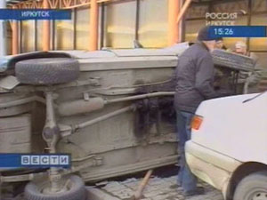 Авария в Иркутске. Накануне автомобиль вылетел на тротуар, где были люди, и перевернулся. Около 5 часов вечера на улице Байкальской столкнулись "Тойота" и "Москвич". От удара отечественная машина сшибла дорожное ограждение, выехала на тротуар, врезалась в стену подземного пешеходного перехода и перевернулась.Скорость у "Москвича" была такой, что металлические прутья ограждения разлетелись на десятки метров. Люди на тротуаре успели отбежать, поэтому никто не пострадал. Водитель "Москвича" получил травму головы, но от госпитализации отказался. Сейчас правоохранительные органы устанавливают виновника аварии.