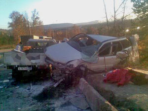 Накануне вечером, около 18:30, на трассе соединяющей Шелехов и Иркутск произошла страшная авария. Водитель, управлявший автомобилем переоценил свои возможности… Пассажиры ехали со свадьбы, водитель превысил скорость, стал цеплять машины, после чего машина подлетела и крышей рухнула на идущую по встречной полосе машину - японский грузовик.Видевшие это водители бросились помогать пострадавшим. Итогом этой страшной аварии стали три трупа, а водитель отправлен в больницу. Пассажиры не были пристегнуты ремнями безопасности. Пока не известно, был ли трезв водитель.