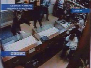 Дерзкие ограбления в Иркутске. Накануне только за один день банда налетчиков совершила сразу два вооруженных нападения.Среди белого дня, в 4 часа в самом центре города преступники ворвались в ювелирный магазин. Неподалеку - здание ГУВД области и управления ФСБ. Один грабитель дважды выстрелил в охранника из травматического пистолета. Его подельник перепрыгнул через прилавок и начал собирать украшения. Но вынести награбленное им не удалось. Началась настоящая схватка. Охранник не только сумел выгнать одного преступника, но и, заперев дверь, пытался задержать другого. То, что выронил налётчик, подобрали посетители и отдали продавцам. Оказавшийся на улице преступник выбил стеклянную дверь и всё-таки освободил сообщника. Грабителям достались только две золотые цепочки стоимостью около 20 тысяч рублей.
