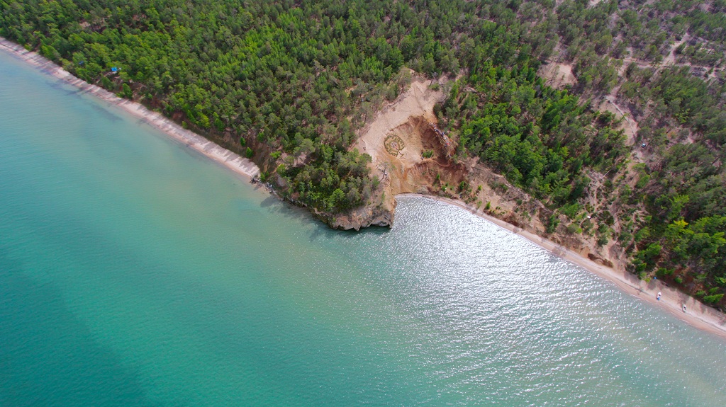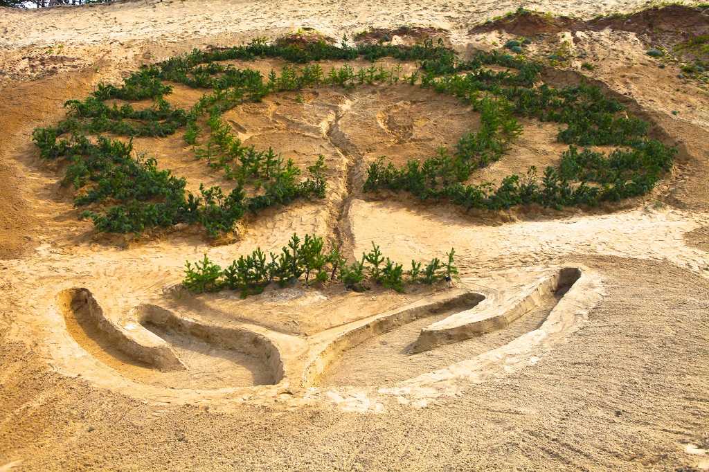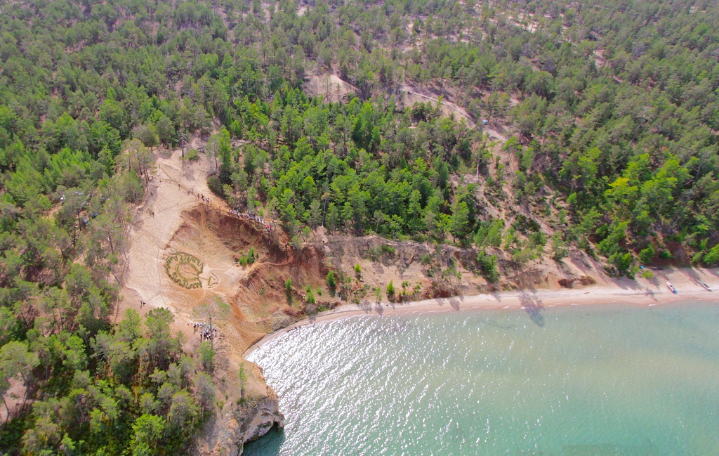 Эмблема акции "Поможем природе вместе!" - зеленое дерево, поддерживаемое заботливыми руками. Ведущие российские художники по нестандартным материалам с помощью десятков волонтеров вырезали огромный силуэт дерева на песчано-глинистом откосе Сарайского пляжа. Скульпторы из Ангарска, Екатеринбурга, Кировска и Хабаровска потратили на эту работу несколько дней, после чего крона "нарисованного" дерева по-настоящему зазеленела - сотни саженцев, помещенных в логотип акции, будут отправлены в регионы-участники как символ экологической ответственности граждан перед своей страной.