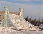 Элемент, без которого ледовый городок нельзя считать полноценным, конечно, горка. До ума строители ее доведут позже. Те же, кому кататься невтерпеж, довольствуются пока малыми формами.